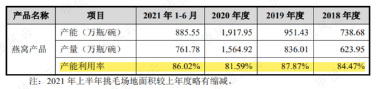 目前,公司拥有每年生产1,900万瓶燕窝产能,产能利用率在80%左右。