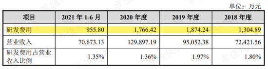 2018年至2021年上半年,公司的研发费用率仅在1%左右。2018年至2021年上半年,公司累计研发费用仅6,000万元。