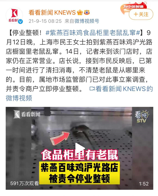 2021年9月12日,有媒体报道,上海市民王女士拍到紫燕百味鸡沪光路店橱窗里老鼠乱窜。