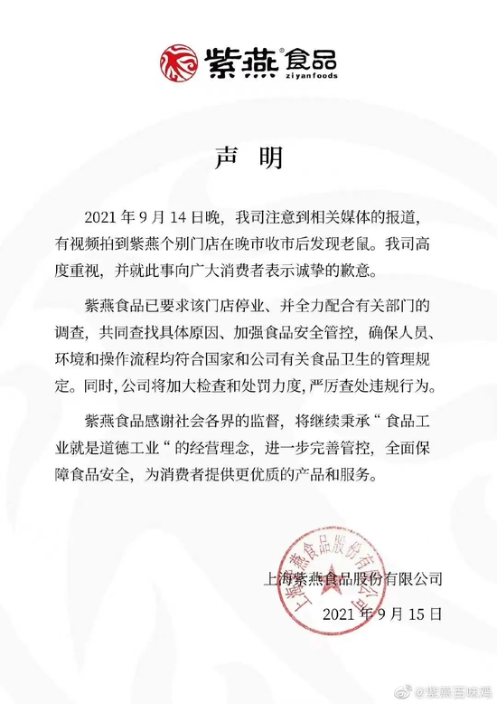 随后,紫燕食品于2021年9月15日在其官方微博“紫燕百味鸡”上发布声明,向消费者表达了歉意,并表示已要求该门店停业,配合有关部门调查。