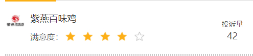 此外,记者在新浪旗下消费者服务平台黑猫投诉搜索“紫燕百味鸡”,显示共有42件投诉量,其中也不乏食品安全方面的投诉,包括吃到异物等问题。