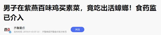 无独有偶,2019年1月3日,《齐鲁晚报》旗下齐鲁壹点也曾报道,山东济南一男子在紫燕百味鸡吃出蟑螂。