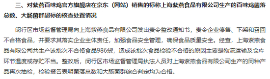 而早在2017年,上海市食品药品监督管理局下发的《关于对国家食品药品监督管理总局通告不合格食品核查处置情况的公告(2017年第7期)》中,也提到了某电商平台紫燕百味鸡官方旗舰店菌落总数、大肠菌群超标情况。