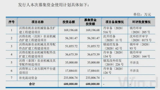 沃得农机募集资金有23.38亿用于补充流动资金,剩余将用于投建沃得农机农业机械装备改扩建工程建设项目、沃得农机(沈阳)农业机械改扩建工程建设项目、沃得高新农业机械及其零配件改扩建工程建设项目、沃得(泰国)农业机械及其零配件制造项目、沃得智云工业互联网平台建设项目,分别拟投资约16.92亿、5.64亿、5.10亿、3.67亿、3.50亿、1.79亿。