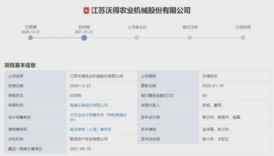 江苏沃得农机于2020年12月23日获得创业板上市受理,于2022年1月21日IPO审核状态变更为已问询,目前已至上市委审议阶段。