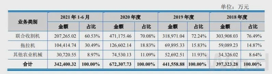 据沃得农机招股书显示,报告期各期,发行人核心产品联合收割机销售数量分别为34,496台、34,043台、48,222台和20,486台,2018年至2020年履带式联合收割机国内市场占有率分别为48.86%、56.22%和 66.27%,呈现稳步上升趋势,连续三年排名行业第一,继续巩固联合收割机领域行业龙头地位。