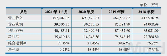 从业绩情况来看,公司2018年、2019年、2020年、2021年1-6月营业收入分别为41.35亿、46.26亿、69.77亿、35.74亿, 2018年-2020年的营收复合增长率为29.90%,其中2020年营收实现跨越式增长,同比增速达50.82%。沃得农机在招股书中表示,2020 年以来,农业机械行业逐步进入上升通道,发行人积极调整发展战略,逐步发力拖拉机市场,营业收入实现同比大幅增长。