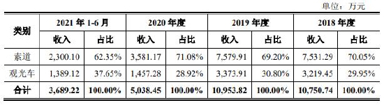 青都旅游目前拥有青城前山索道特许经营权和都江堰市环保旅游观光车特许经营权。2018年至2021年6月(报告期),公司分别录得主营业务收入1.08亿元、1.10亿元、5038.45万元和3689.22万元。其中索道业务常年占主营业务收入约七成。按业务类型分,青都旅游主营业务占比如下: