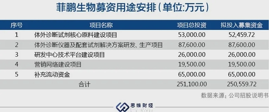 募资用途显示,菲鹏生物本次IPO拟募资25.06亿元,其中5.25亿元用于体外诊断试剂核心原料建设项目、8.76亿元用于体外诊断仪器及配套试剂解决方案研发生产项目、2.6亿元用于研发中心技术平台建设项目、1.95亿元用于营销网络建设项目和6.5亿元用于补充流动资金。