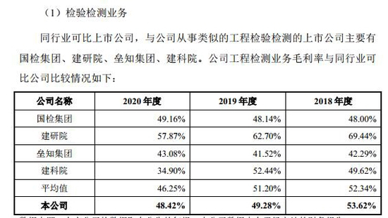 而同期,建科股份(2018年~2021年上半年)检验检测业务毛利率分别为41.43%、49.70%、52.16%和51.39%。