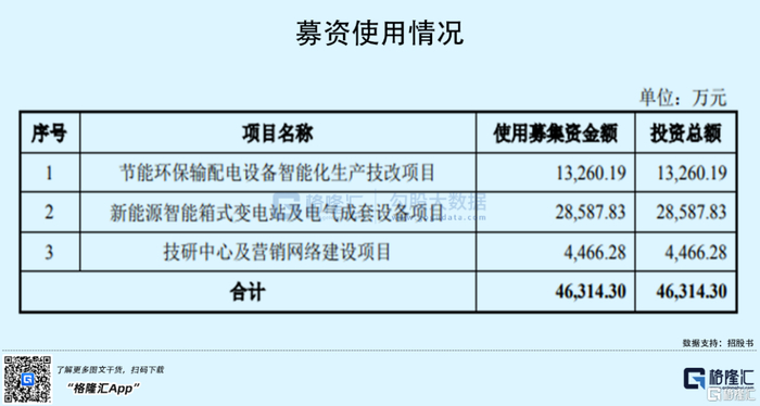 本次IPO拟募资4.63亿元,主要用于节能环保输配电设备智能化生产技改项目、新能源智能箱式变电站及电气成套设备项目、技研中心及营销网络建设项目。