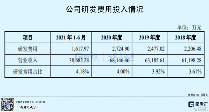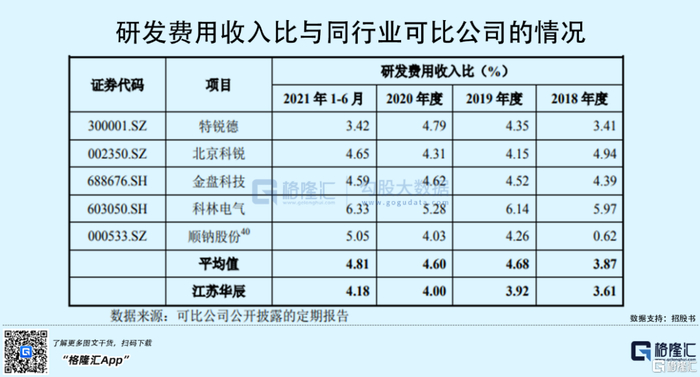 报告期内,江苏华辰研发费用分别为2206.48万元、2477.02万元、2724.90万元、1617.97万元,占营收比例分别为3.61%、3.92%、4.00%、4.18%,低于同行业平均值。