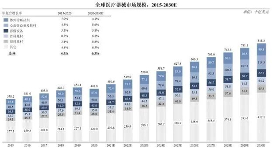 全球人口老龄化、慢性病增加和医疗支出增长带来了全球医疗器械市场规模的扩大,新冠疫情加速了市场的扩张。据灼识咨询数据,全球医疗器械市场规模在2020年已经突破4400亿美元,预计到2030年,全球医疗器械市场规模将超过8000亿美元,2020年到2030年年均复合增长率为6.3%。