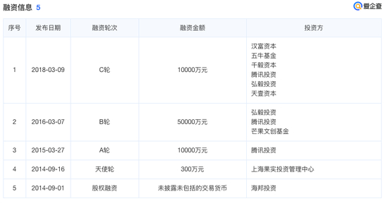 2018年3月,公司正式宣布完成数亿元人民币C轮融资。本轮投资方包括汉富资本,五牛控股和千毅资本等机构,老股东腾讯、弘毅投资继续加持。