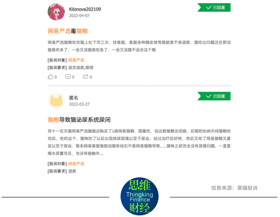 一位消费者在黑猫投诉平台上说:“我的猫在吃了网易严选的猫粮后,上吐下泻三次,联系平台后,客服人员一会儿说是因为猫是吃多了,一会儿又说猫是吃急了,还说我的猫不适合这个粮。就这样一直被踢皮球,不退款。”此外,还有消费者的宠物猫食用了网易严选的猫粮后,出现排尿困难以至于尿血。