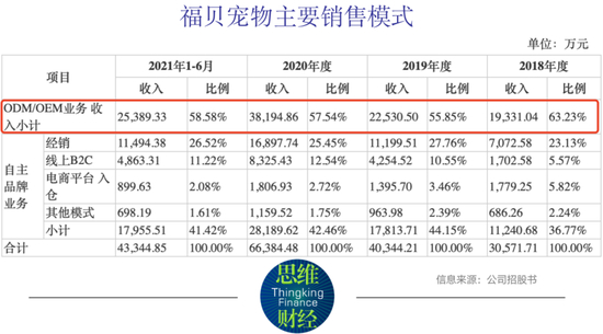 从销售模式看,ODM/OEM业务是福贝宠物重要的销售模式;2021年上半年,福贝宠物的这项业务收入为2.5亿元,占比58.58%,其余为自主品牌业务,具体收入如下表所示。
