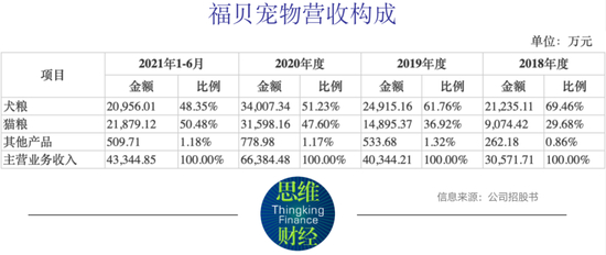 从营收结构看,福贝宠物以销售犬粮和猫粮为主。2021年上半年,犬粮贡献了2.1亿元的营收,占比48.35%、猫粮贡献了2.2亿元的营收,占比50.48%。从数据可以看出,早几年犬粮占比明显较高(2018年为69%),近几年猫粮明显上升。