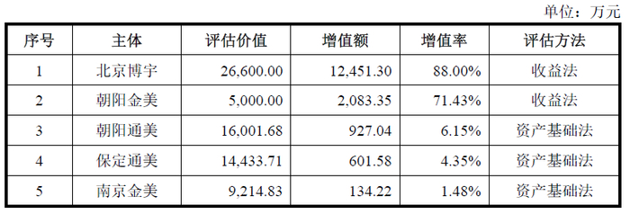 其中,公司对北京博宇和朝阳金美采用收益法评估,增资率分别为88%、71.43%,而对朝阳通美、保定通美和南京金美则采用资产基础法,增资率分别为6.15%、4.35%、1.48%。并在2020年12月29日匆匆完成此次重组。