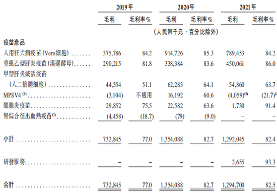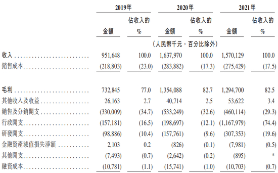 根据招股书的披露,艾美疫苗2019年-2021年的总收入分别是人民币近9.52亿、近16.38亿、15.7亿。毛利分别是人民币超7.32亿、13.54亿、12.94亿,分别占同期收入的77.0%、82.7%、82.5%。同期的研发成本分别是人民币9890万、1.578亿、3.074亿,分别占同期收入的10.4%、9.6%及19.6%。