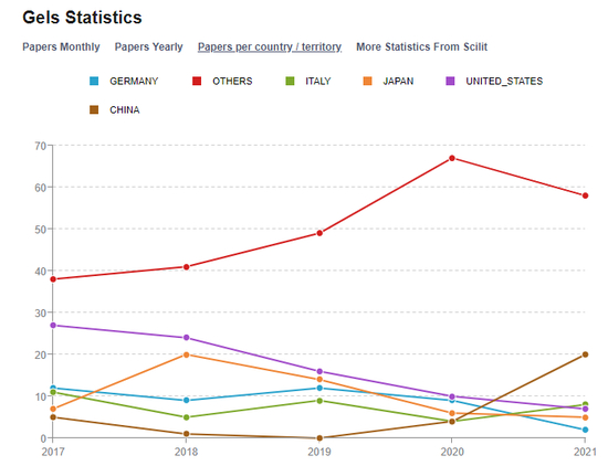 而燕之屋研究员们发表论文的《Gels》创办于2015年,2020年方才被SCIE收录,影响因子4.7,在影响因子评定机构科睿唯安(Clarivate)的榜单中排名2240。随之而来的就是发文量的暴涨——2018年杂志共发表了83篇文章,2019年为49篇,2020年为52篇,燕之屋研究员们发文的2021年则直接飙升至301篇。其中,来自中国的发文量在2021年有大幅度的增长,由2020年的4%直线上升至20%,是所有国家和地区中增长势头最为猛烈的。