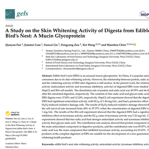 文章中提到,实验表明:“从燕窝消化物(酶解物)中不同成分的贡献率分析表明,燕窝肽是其中主要的抗氧化成分,贡献率为85.87%,适合开发新一代美白保健品。”银柿财经记者对照英文论文原文,却发现这样的描述有“断章取义”之嫌。论文结论部分称,EBN蛋白,也就是所谓的“燕窝肽”难以溶解,超过50%的糖蛋白在模拟消化之后仍然不溶解,消化后的水溶性蛋白中34%仍未水解成多肽;燕窝卖家一直引以为豪的“燕窝酸”也就是燕窝中含有的唾液酸,在经胃肠消化之后有17.82%以游离形式存在,12.24%与聚糖结合,15.39%与蛋白质结合,54.55%仍不溶于消化上清液,整体消化利用率较低;燕窝消化物中的主要抗氧化成分是EBN蛋白,抑制酪氨酸酶活性的主要成分则是游离唾液酸。而有关于“适合开发新一代美白保健品”的结论,则仅仅出现在最后一句—— “完全消化后的燕窝产品适合开发新一代美白保健品(The products of the complete digestion of EBN are suitable for the development of a new generation of whitening health products)”。