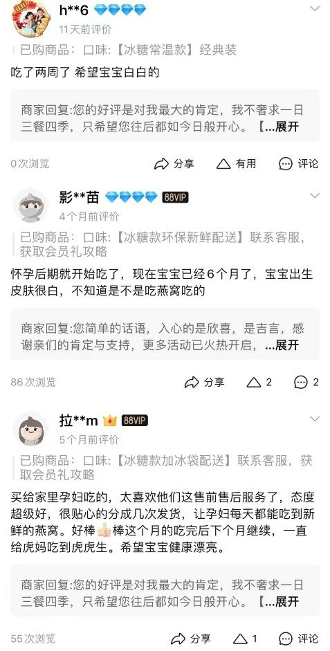 “准父母”们对燕窝的期待功效评论。图源:淘宝