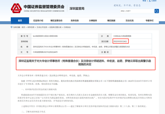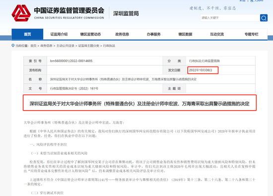 2022年10月8日,深圳证监局发布了一张警示函,剑指大华会计师事务所(特殊普通合伙)及其注册会计师申宏波、万海青。