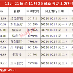需要关注的是,据Wind新股发行数据披露,即将于下周(11月21日至11月25日)进行网上申购的新股公司共有8家,包括科创板公司1家、创业板3家、北证2家、深证主板和上证主板各1家。在即将申购的8家公司中,行业类别涉及通用设备制造业、专用设备制造业、电气机械和器材制造业、资本市场服务,以及计算机、通信和其他电子设备制造业五大行业(详见附表)。与本周相比,下周有更多标的可供喜欢“打新”的投资者选择。