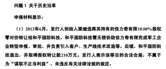2022年11月30日公布的《发行人及保荐机构关于审核中心意见落实函的回复》显示:2012年6月,发行人创始人梁继选将其持有的佳力奇有限10.00%股权零对价转让给和平国防科技。和平国防科技需无偿协助佳力奇有限完成军工企业转型申报、审批,并负责引入客户、生产线技术改造等。后续,和平国防科技退出,并取得股权转让款210万元。发行人表示该等目的合法合规,不属于为“谋取不正当利益”,未违反有关法律法规的规定。