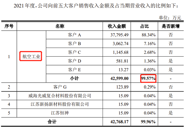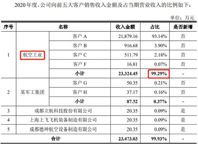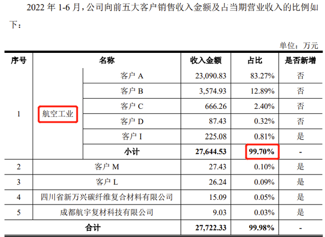 2019年度、2020年度、2021年度和2022年1-6月,以同一控制下合并口径计算,公司向前五名客户合计销售占比分别为100.00%、99.93%、99.96%和99.98%,其中来源于中国航空工业集团有限公司下属单位的收入占比分别为99.86%、99.29%、99.57%和99.70%。公司客户集中度较高,对主要客户航空工业构成一定依赖性。