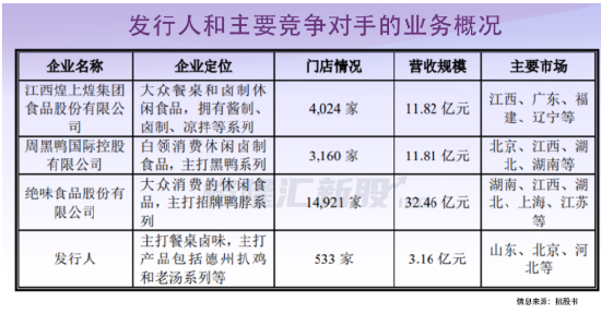 可以发现,德州扒鸡将煌上煌、周黑鸭、绝味食品等视为对手,不过,目前在营收规模、门店数量等指标上,德州扒鸡还都处于下风。