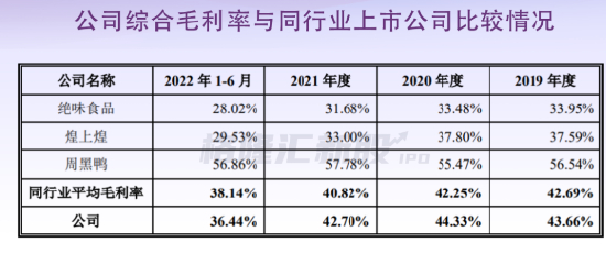 报告期内,德州扒鸡的综合毛利率分别为43.66%、44.33%、42.70%、36.44%,存在波动,低于周黑鸭,高于绝味食品和煌上煌,对此,证监会要求公司说明与同行业可比公司毛利率的差异原因和合理性。