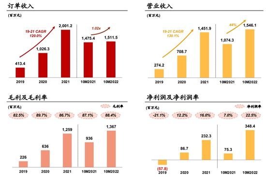 在营收高速增长的同时,利润也保持着高增长。除2019年出现0.58亿元亏损外,2020、2021两年分别实现0.87亿元和2.32亿元的净利润。根据招股书披露的信息,2022年前10个月公司净利润为3.48亿元,已超过2021年全年。