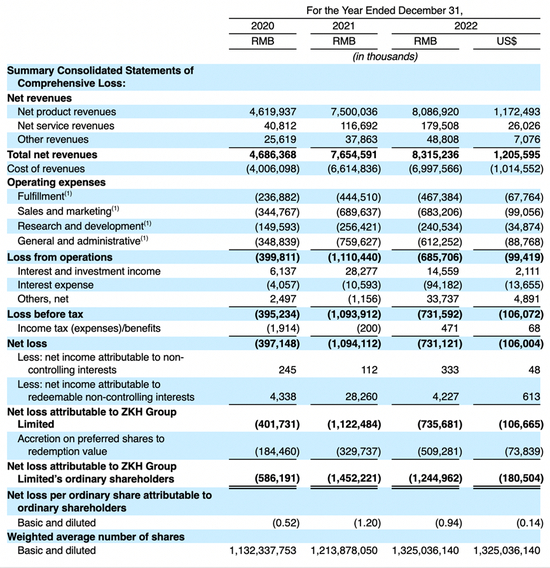 营收动辄数十亿,但震坤行亏损也是摆在眼前——2020年到2022年,震坤行净亏损分别3.971亿元、10.941、7.311亿元,排除因发行F系列可转换票据而产生的股份补偿费用和利息费用的影响,调整后净亏损分别为3.052亿元、9.108亿元和6.261亿元。