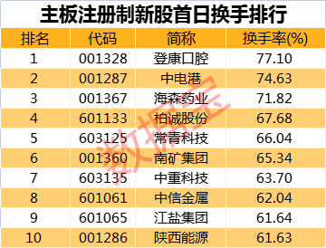 主板注册制首批新股上市首个交易日行情火爆。数据宝统计,10只新股平均换手率67.16%,且全部换手率在60%以上。登康口腔、中电港和海森药业是当日换手率三强,依次为77.1%、74.63%、71.82%;江盐集团和陕西能源换手率靠后,分别为61.64%、61.63%。