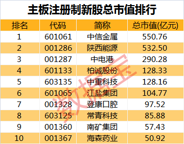 数据宝统计,主板注册制10只新股总市值超过2000亿元,但最新流通市值仅为380.94亿元,占比18.8%。流通市值在百亿元的新股仅陕西能源一只,为103.3亿元。南矿集团和海森药业的流通市值最低,均不足20亿元。