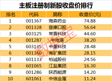 从今年上市主板次新股最新收盘价看,海森药业、登康口腔股价仅次于金海通、多利科技。陕西能源、中信金属则仅比宝地矿业高。整体看,这10只新股首日收盘价区间分布分散,医药及科技类的收盘价相对较高,能源矿业类的收盘价较低,符合目前A股市场整体股价分布格局。