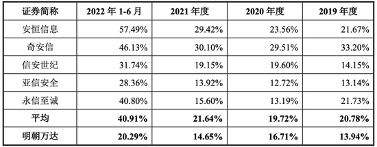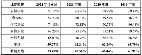 明朝万达的招股书中提到,根据赛迪顾问发布的《2021-2022中国网络信息安全市场研究年度报告》,公司在中国数据安全产品市场2021年销售额所占比例为5.8%,排名位居中国数据安全市场第二名。