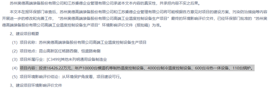 不过查阅公开资料,奥德装备在2021年3月30日委托江苏秉德企业管理有限公司编制的拟报批的环境影响报告表全本公示中显示,高端工业温度控制设备生产项目投资16426.22万元,年产10000台模温机等制热温度控制设备、4000台制冷温度控制设备、600台冷热一体设备、110台锅炉。称苏州奥德高端装备股份有限公司和江苏秉德企业管理有限公司承诺本文本内容的真实性,并承担内容不实之后果。明显与招股书所示的投资总额,预计通道有所不一。