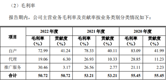 具体来看,国创医药的自产及代理业务毛利率这三年也同样下滑不小。报告期内,自产产品毛利率分别为83.09%、78.33%、72.99%;代理产品毛利率分别为28.85%、26.93%、19.06%。