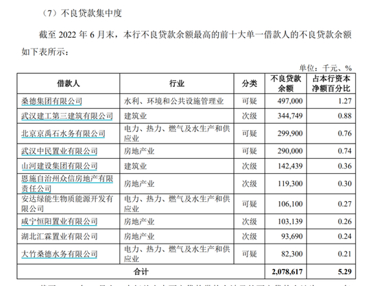 湖北银行在《招股书》也坦言,截至2022年6月末,较A股已上市城市商业银行的水利、环境和公共设施管理业平均不良贷款率,该行不良贷款率高于平均水平,主要原因为2021年桑德集团4.97亿元贷款质量恶化所致。