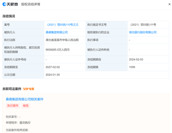 据天眼查显示,桑德集团仍有48笔股权被冻结。其中,2024年1月30日公示,桑德集团持有的湖北银行993.93亿元数额的股权,为冻结状态,冻结期限2024年2月3日至2027年2月2日,执行法院为湖北省宜昌市中级人民法院。