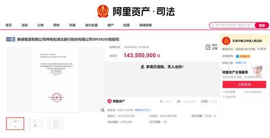 4月22日上午10时,桑德集团持有湖北银行5993.93万股股权,被天津市第三中级人民法院进行公开拍卖。该笔股权评估价2.05亿元,起拍价1.44亿元,按照起拍价算约为2.39元/股。湖北银行2022年末每股净资产为3.86元,若以此推算,此次拍卖相当于打了6.2折。