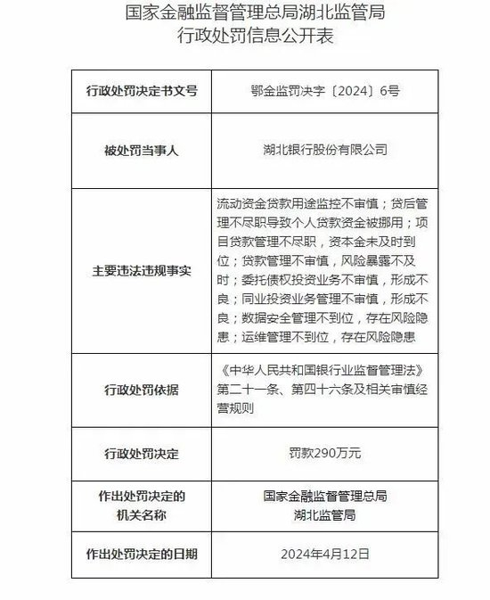 贷款业务方面,4月12日,湖北银行刚“吃”一张290万元罚单。据《行政处罚决定书》显示,主要违法违规事实包括贷款管理不审慎,风险暴露不及时等。