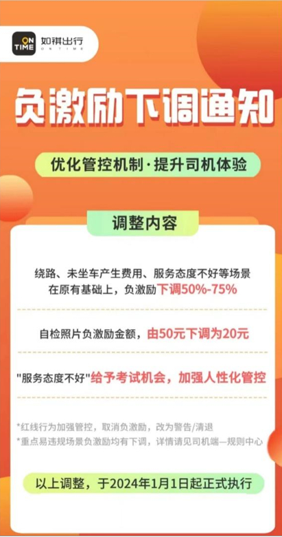 2023年12月30日,该公众号再次发文称,将下调负激励,该措施于2024年1月1日正式执行,下调内容中包括:绕路、未坐车产生费用、服务态度不好等场景在原有基础上,负激励下调50%-75%;自检照片负激励金额从50元下调至20元;“服务态度不好”给予考试机会。