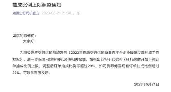 从平台的抽成比例来看,据“环京津新闻网”报道,2022年,如祺出行的抽成比例为30%。后于2023年6月21日,如祺出行在“如祺出行司机官方” 微信公众号上发文表示,将于2023年7月1日0时将订单抽成比例下调为不超过29%。