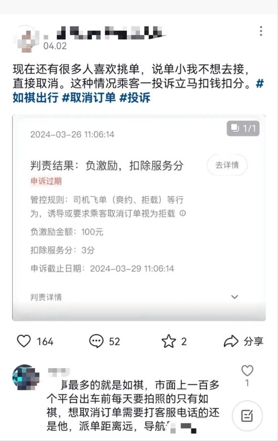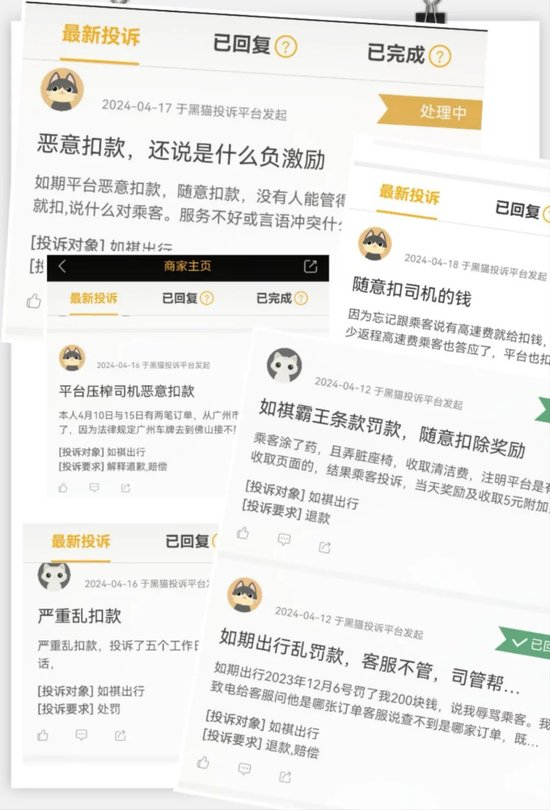 在黑猫投诉上,也有部分司机投诉如祺出行“随意扣款”。2024年4月16日,有司机表示,本人在4月10日、15日有两笔订单,从广州市出发去佛山市,因为规定广州车牌到佛山接不到单,只能空车跑回来。因此,乘客同意多给10元作为感谢费,平台有录音可以调取,结果平台判我违规收取费用,进行负激励200元。