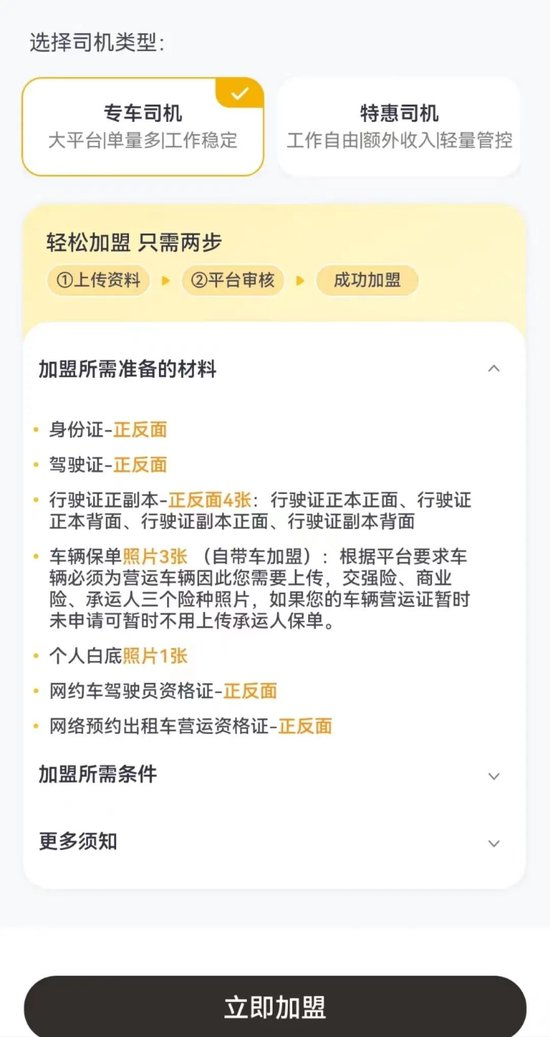 如祺出行在实操中,也是这样要求司机的。野马财经在如祺出行App上发现,在司机加盟条件和注册资料中,必须提交身份证、驾驶证、行驶证、车辆保单(自带车加盟)、网约车驾驶员资格证、网络预约出租车营运资格证等照片资料,待平台审核通过后,申请者便可以成为一名加盟司机。