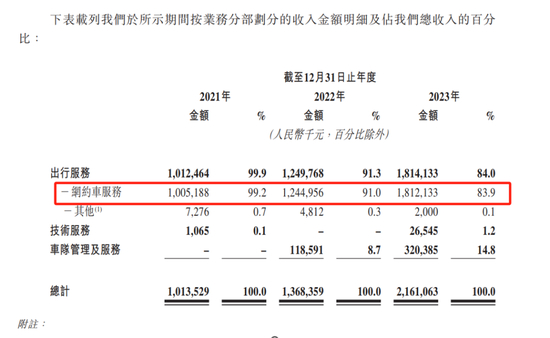其中,网约车业务是公司最主要收入来源。2021年至2023年,如祺出行的营收分别达到10.14亿元、13.68亿元、21.61亿元,其中网约车贡献的收入分别达到10.05亿元、12.45亿元和18.12亿元,占总收入的比重分别为99.2%、91%和83.9%。