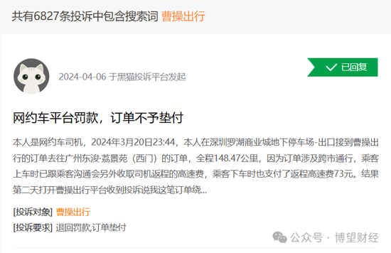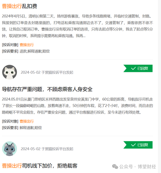 但是,据博望财经了解,在黑猫投诉平台,曹操出行累计投诉已经达6827条,除了少部分来自司机投诉平台胡乱克扣司机费用,大部分都是乘客对路线、服务、价格、安全隐患的质疑,从服务不达标、乱收车费、霸王条款、客服踢皮球态度恶劣等等不一而足。
